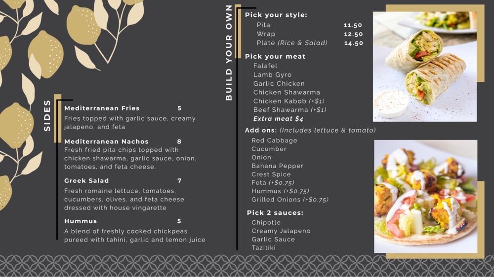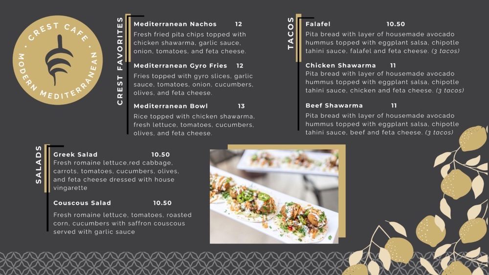 With vegan and vegetarian options, along with delicious sides like Mediterranean Fries, Crest Cafe is a must-try for any Mediterranean food enthusiast!